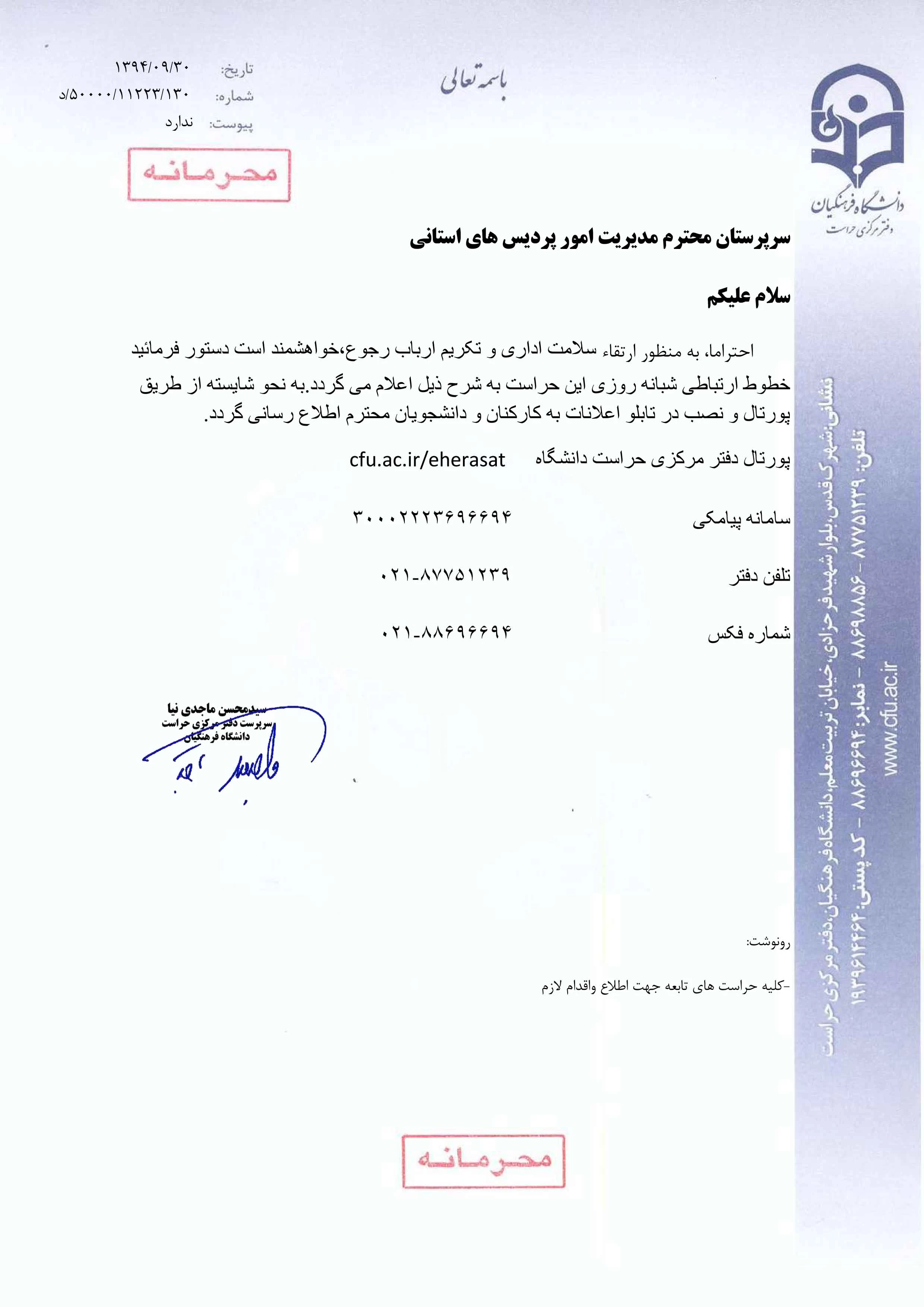 قابل توجه همکاران، اساتید و دانشجویان گرامی اطلاعیه مهم حراست دانشگاه فرهنگیان 2