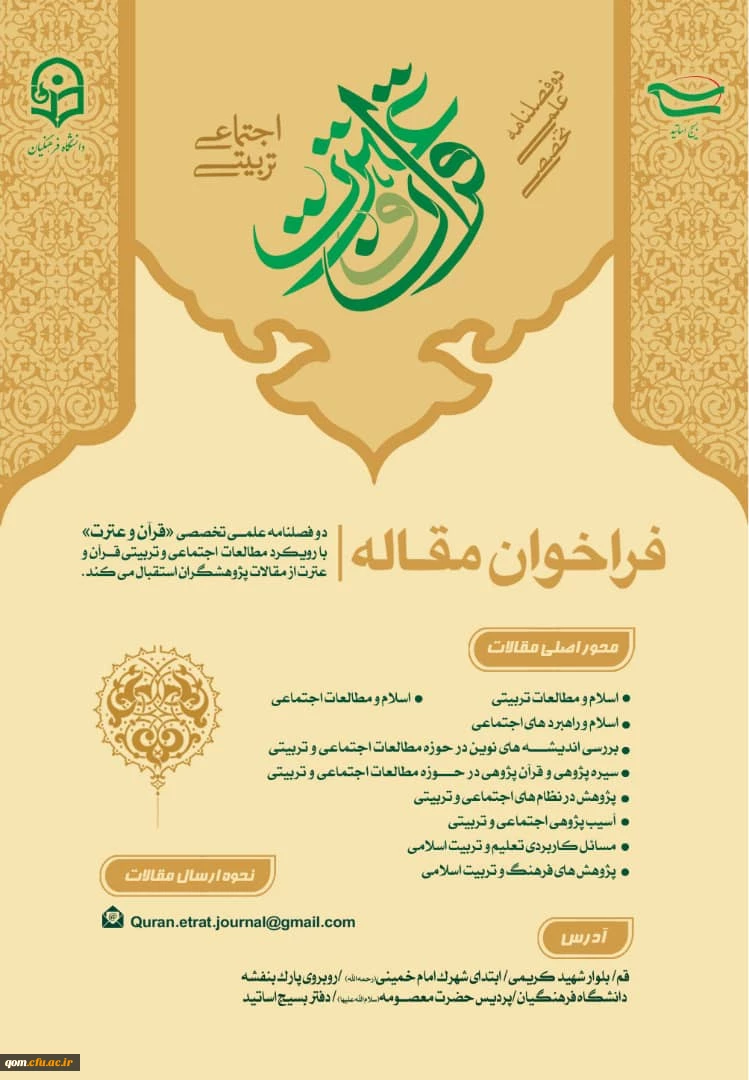 دو فصلنامه علمی تخصصی«قرآن و عترت» با رویکرد مطالعات اجتماعی و تربیتی قرآن و عترت از مقالات پژوهشگران استقبال می کند. 2